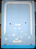 By having the stencils in one piece there is no question where each element of the sideart should be placed, just use the registration shapes (the squashed hourglass in this case) and away we go. But, this method does mean that the vinyl will have to stretch the whole height of the cabinet, and at three colors per side that means 9 separate stencil pieces need to be made.